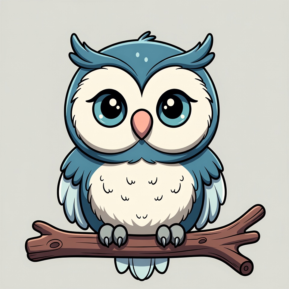 animal, big eyes, bird, blue owl, branch, cartoon owl, clipart, cute owl, feathers, illustration, isolated background, kawaii, perched, white eyes, wooden branch, owl