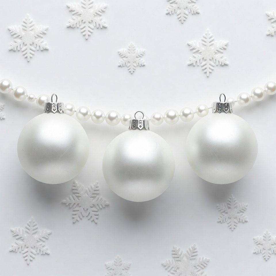 Three large white Christmas baubles hang from a strand of white pearls against a white background scattered with snowflakes. The glossy ornaments are centered and draped elegantly with the pearl necklace. Snowflakes are delicately placed throughout the composition.