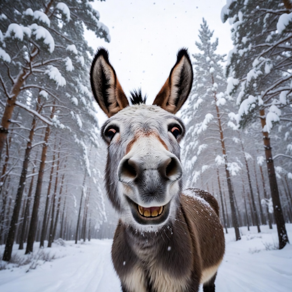 A gray donkey with large ears and a wide smile stands on a snowy path in a dense pine forest. Snow covers the ground, trees, and the donkey's fur, with falling snowflakes visible. The close-up view highlights the donkey's expressive eyes, nose, and teeth.