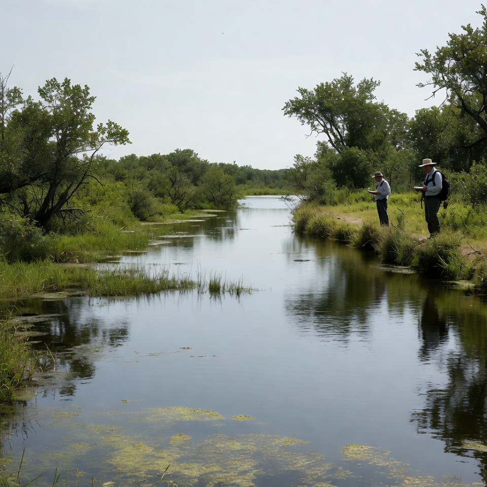 White, angling, backpack, bank, calm water, fishing, fishing rod, grass, green, hats, landscape, male, nature, outdoors, reflection, riparian, river, standing, stream, sunny day, trees, two men, vegetation, water, waterway, men
