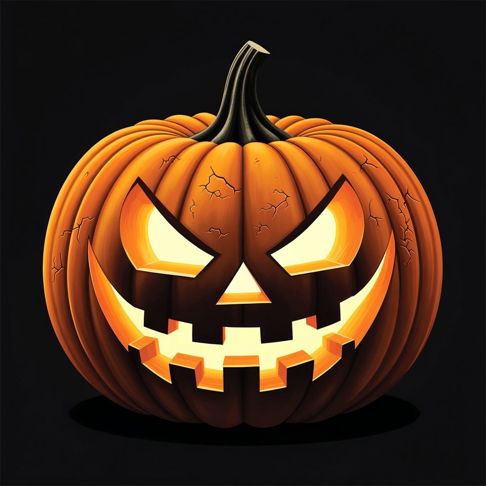 A carved jack-o'-lantern pumpkin features glowing yellow eyes, nose, and jagged teeth against a solid black background. The orange pumpkin has a textured surface with cracks and a sturdy green stem on top. It is digitally illustrated with a glowing effect and subtle shadow.