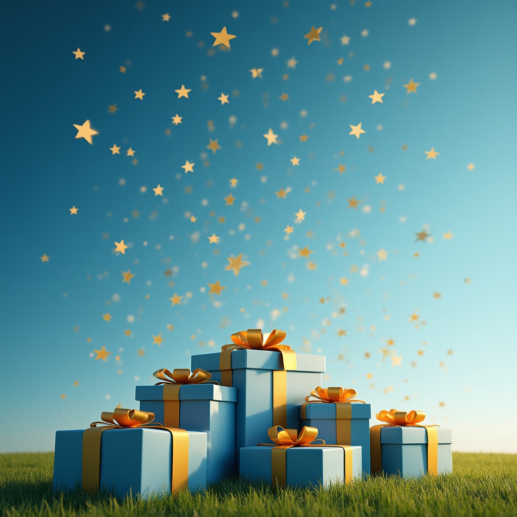 A tall stack of blue gift boxes wrapped with yellow ribbons stands on green grass. Golden stars sparkle and float around the gifts against a bright blue sky. The scene features a 3D rendered illustration with a festive, isolated background.