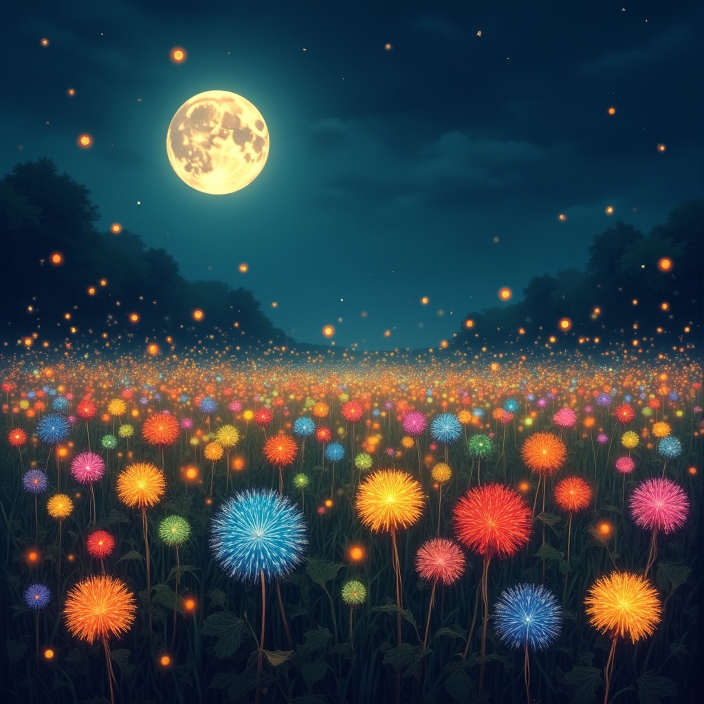 A vibrant field of colorful dandelions glows with multicolored lights under a large full moon at night. Stars twinkle in the dark sky above scattered clouds, and fireflies illuminate the surrounding dark forest. The illustration features vivid pink, blue, yellow, and orange dandelion blooms on green stems.