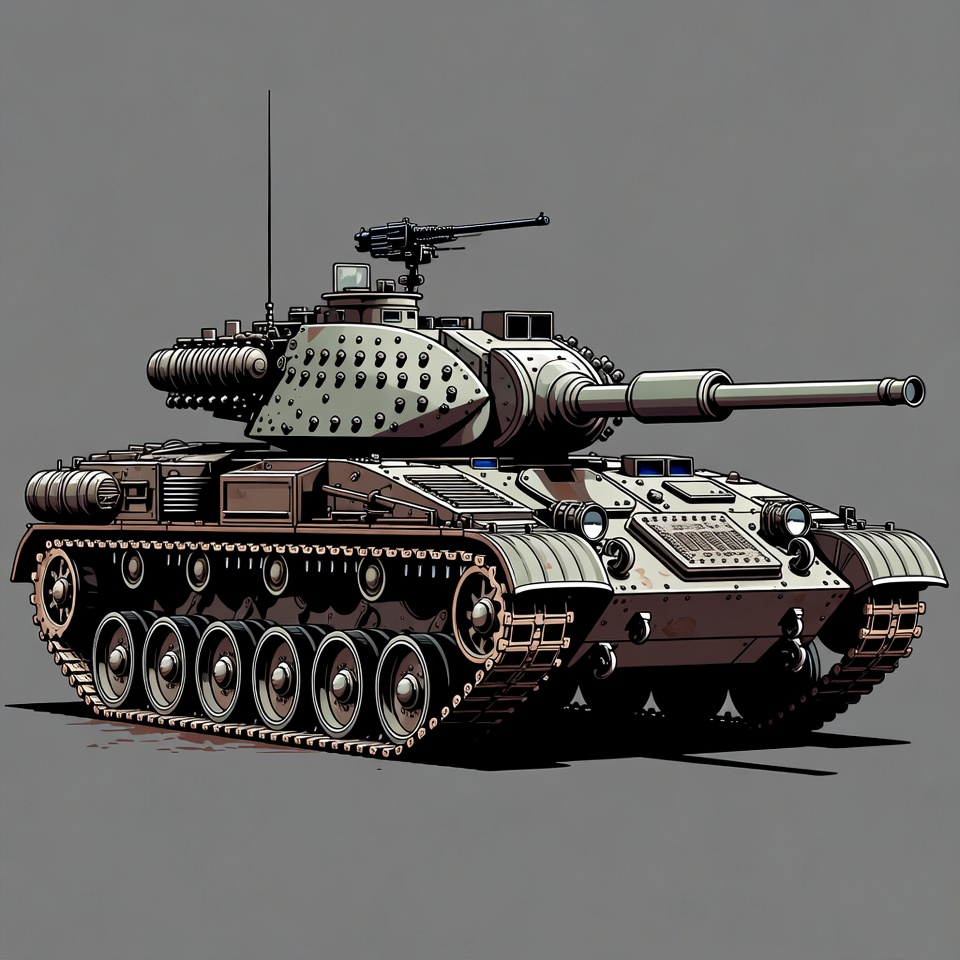 A detailed cel-shaded illustration of a military tank on a gray background. The tank features a long barrel cannon, machine gun turret, and tracks with riveted armor plating. It has antennas and lights on a beige and brown color scheme.