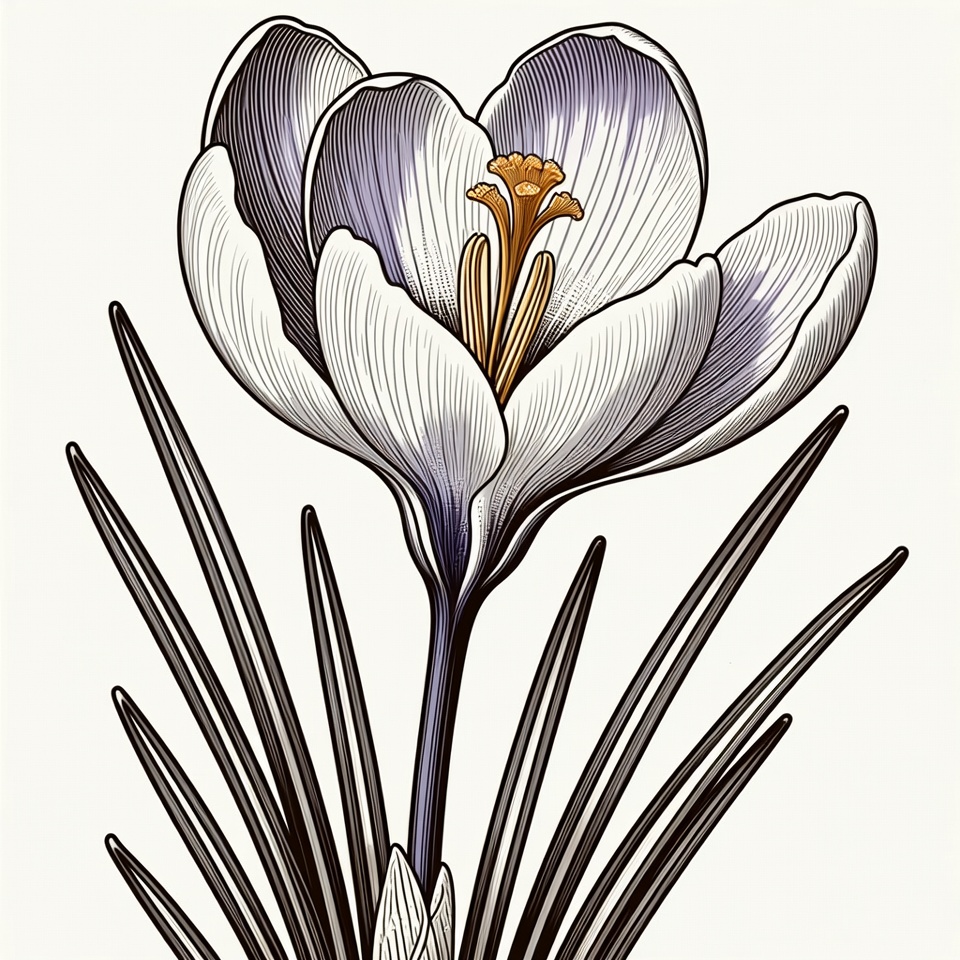 A detailed line drawing illustration of a purple crocus flower with white petals and a bright orange center. The flower stands upright on a thin stem with long green leaves. It is rendered in black ink outlines with subtle shading on a white isolated background.