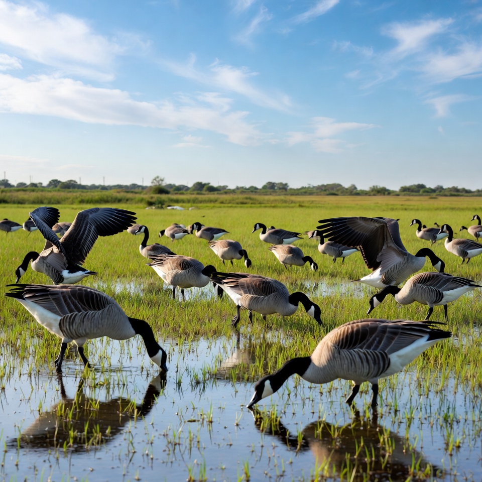 birds, black necked geese, blue sky, clouds, flying geese, foraging geese, geese flock, grass, green reeds, group of geese, marsh, nature, outdoor, paddy field, reflections, shallow water, water birds, wetland, wildlife, Canada geese