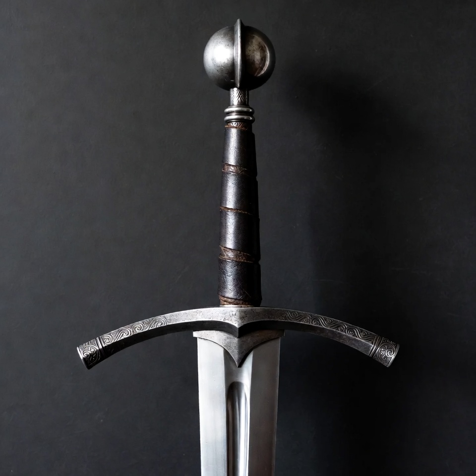 A detailed medieval longsword with a fluted silver blade is centered against a solid black background. The crossguard features intricate engravings, and the grip is wrapped in dark leather with a spherical pommel on top. The sword is positioned vertically, highlighting its sharp edges and ornate hilt.