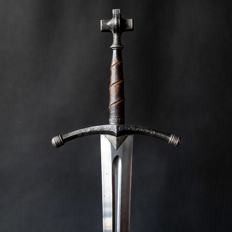 A detailed medieval longsword with a cruciform hilt and wrapped leather grip stands vertically against a solid black background. The double-edged blade shines with metallic luster, and ornate engravings decorate the crossguard. The pommel features a cross-shaped design.