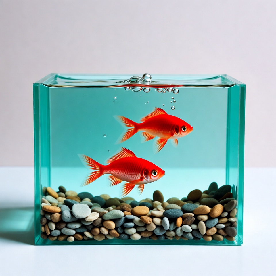 Two vibrant red goldfish swim in a clear glass aquarium filled with water and colorful pebbles at the bottom. Bubbles rise around the fish, and the tank sits on a white surface with a light pink background. The fish have flowing fins and expressive eyes.