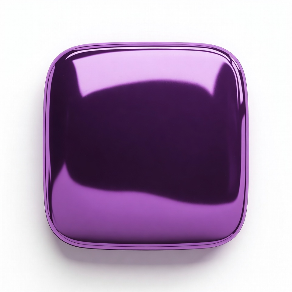 A glossy purple square with reflective surfaces sits centered on a plain white background. The object features smooth, rounded edges and a vibrant metallic purple color. It appears as a 3D rendered clipart element.