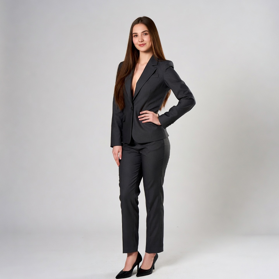 A young woman with long dark hair stands confidently on a plain background wearing a tailored gray blazer and pants suit. She has one hand on her hip and smiles at the camera. She completes the professional look with black high-heeled pumps.