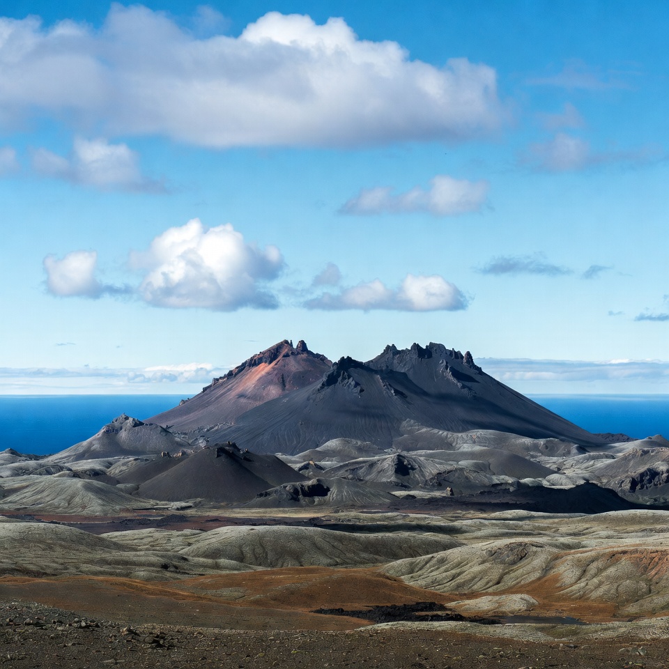 Iceland, ash fields, blue sky, clouds, eruption site, geology, horizon, landscape, mountain, nature, ocean, peaks, rocky ground, rugged terrain, sea, volcanic landscape, volcano
