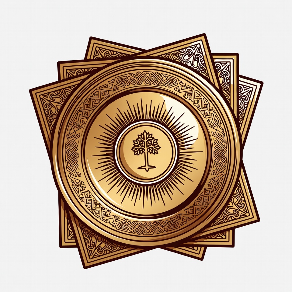 ancient symbol, clipart, cultural motif, decorative seal, geometric patterns, gold design, golden emblem, heraldic symbol, illustration, intricate details, isolated background, mystical tree, ornate borders, radiant circle, shining rays, square frames, stylized tree, vector art, yellow gold, tree of life