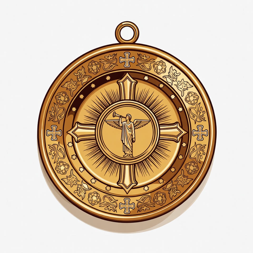 Christian icon, Gabriel, annunciation, badge, brass instrument, circular, clipart, cross, emblem, floral, gold, heavenly figure, illustration, isolated background, medal, ornate, pendant, radiant, religious symbol, stars, trumpet, vector art, wings, angel