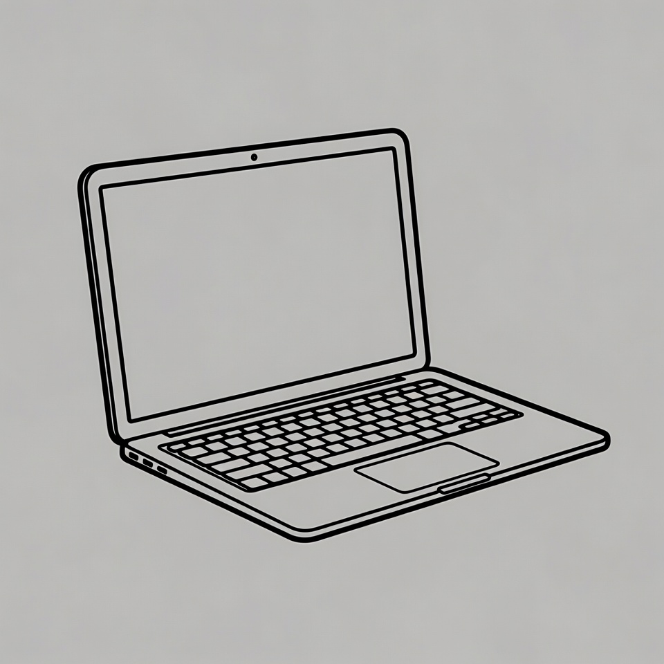 A simple black line drawing of an open laptop computer on a gray background. The illustration shows the screen, keyboard, and trackpad in a clean outline style. It is isolated with no additional elements.