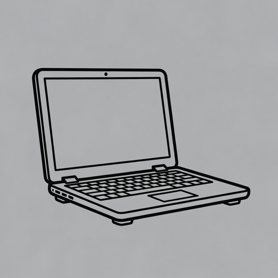 A simple black line drawing of an open laptop computer on a gray background. The screen is blank and the keyboard is detailed with individual keys. It is depicted in a minimalist clipart style.