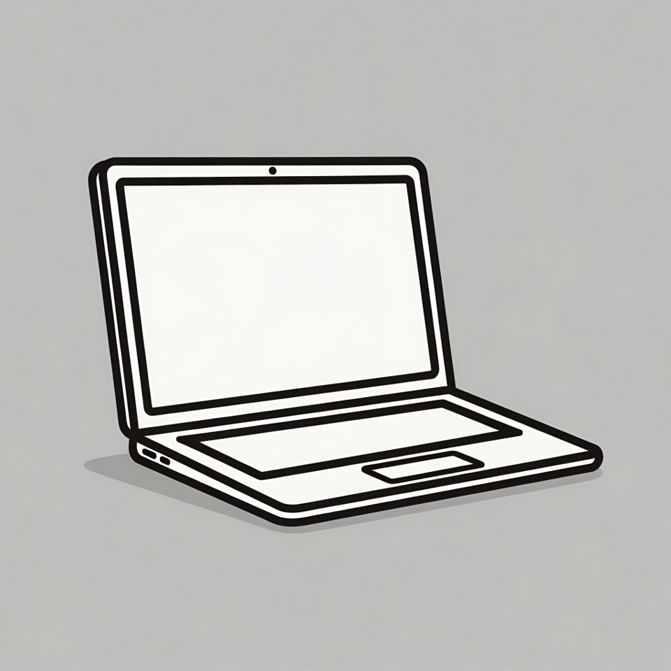 A simple line art illustration of an open laptop computer on a gray background. The laptop features a blank screen, keyboard, and subtle shadow for depth. It is depicted in a clean, minimalist vector style.