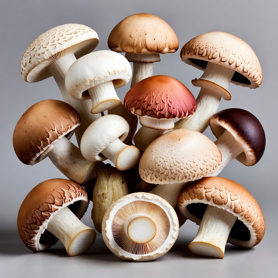 beige mushrooms, brown mushrooms, clustered mushrooms, edible mushrooms, food photography, fresh mushrooms, fungi, gray background, mushroom caps, mushroom gills, mushroom stems, mushroom variety, sliced mushrooms, textured caps, white mushrooms, mushrooms