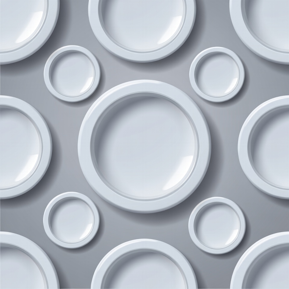 A seamless pattern features multiple white plates of varying sizes arranged on a gray gradient background. The plates have glossy, reflective surfaces and 3D rounded edges. They are positioned in a repeating circular layout for a textured design.