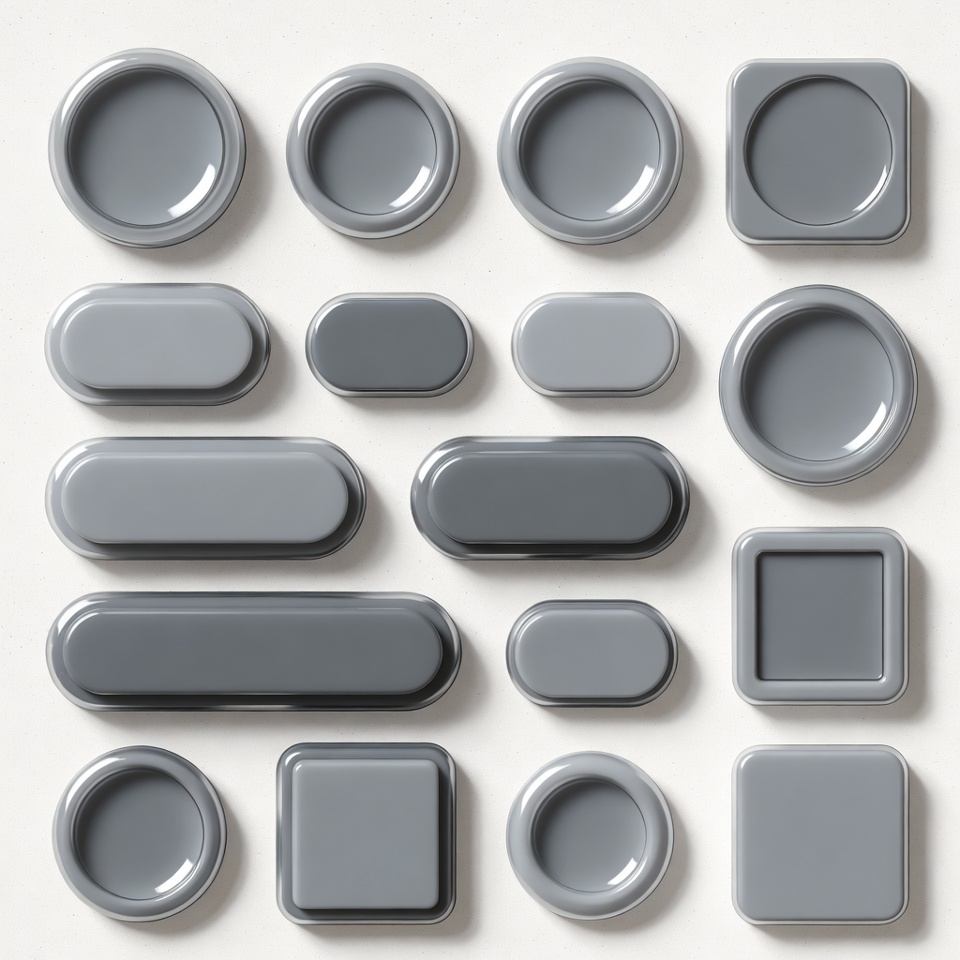 A collection of various gray buttons in different shapes and sizes is arranged neatly on a white background. The buttons include round, oval, square, and rectangular forms, all with a glossy gray finish. They are organized in a grid-like pattern for display.