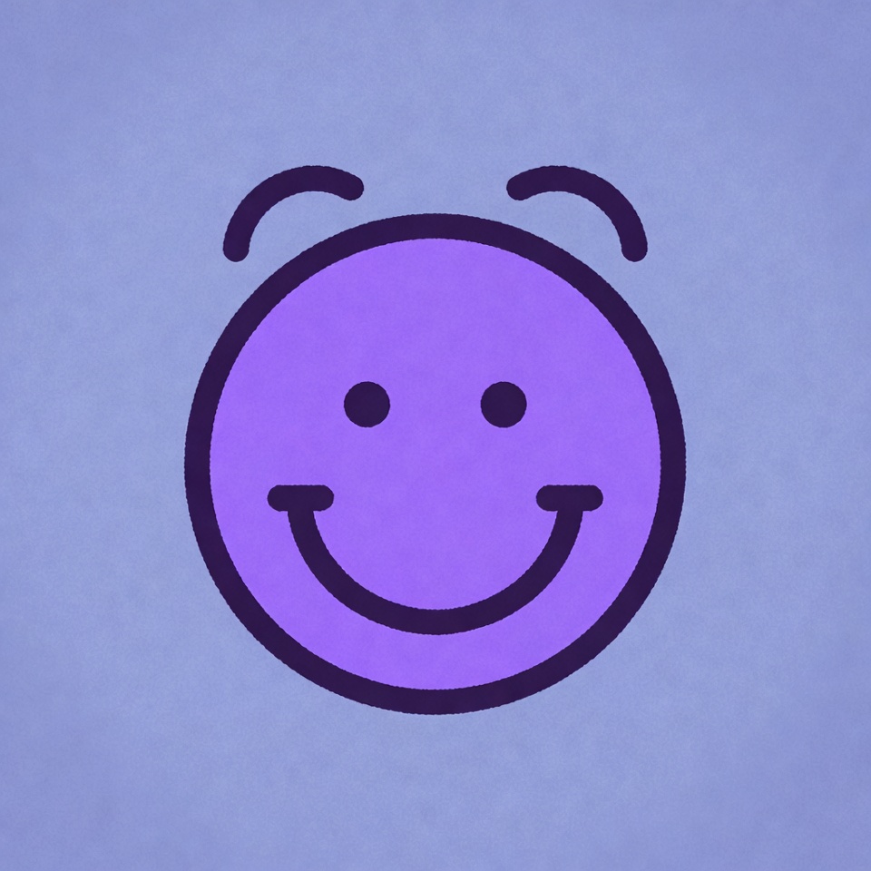 A simple purple smiley face emoji with black outlines on a light blue background. It features curved eyebrows, round eyes, and a wide smiling mouth. The design is bold and cartoonish.