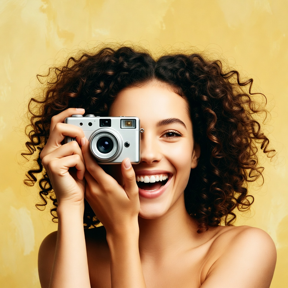 A young woman with curly hair holds a silver vintage camera in front of her face against a yellow textured background. She smiles widely with her teeth showing and eyes visible above the camera. Her shoulders are bare, emphasizing her joyful expression.