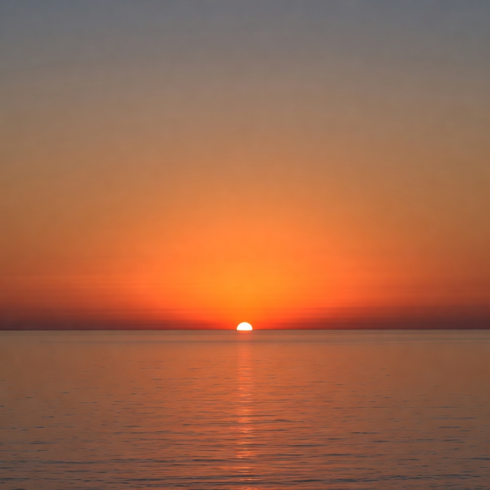 A vibrant orange sun sits low on the horizon, casting a warm glow across the calm sea. The sky transitions from deep blue above to fiery orange near the water. Gentle ripples reflect the sunset colors on the ocean surface.