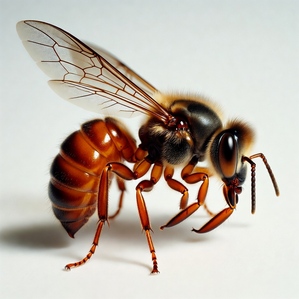 A detailed closeup of a honey bee with orange and black striped abdomen and translucent wings. The bee faces slightly to the side with prominent compound eyes and fuzzy thorax. It is isolated against a plain white background.