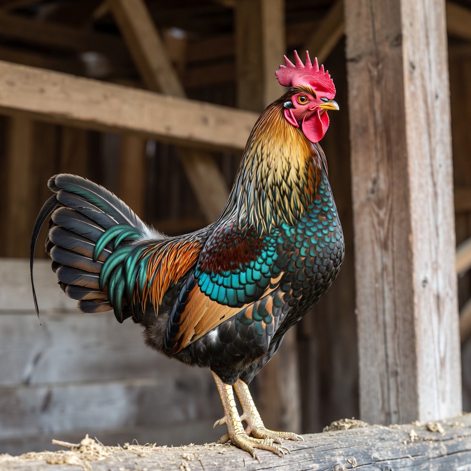 Colorful Rooster Standing in Barn