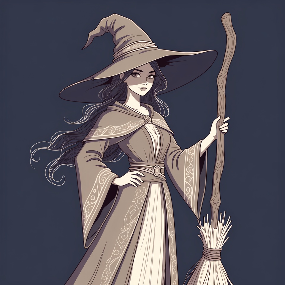 An illustrated young woman dressed as a witch stands confidently on a dark background. She wears a wide-brimmed pointed hat, a flowing gray robe with intricate patterns, and holds a wooden staff in one hand and a broom in the other. Her long wavy hair flows behind her, and she has a subtle smile.