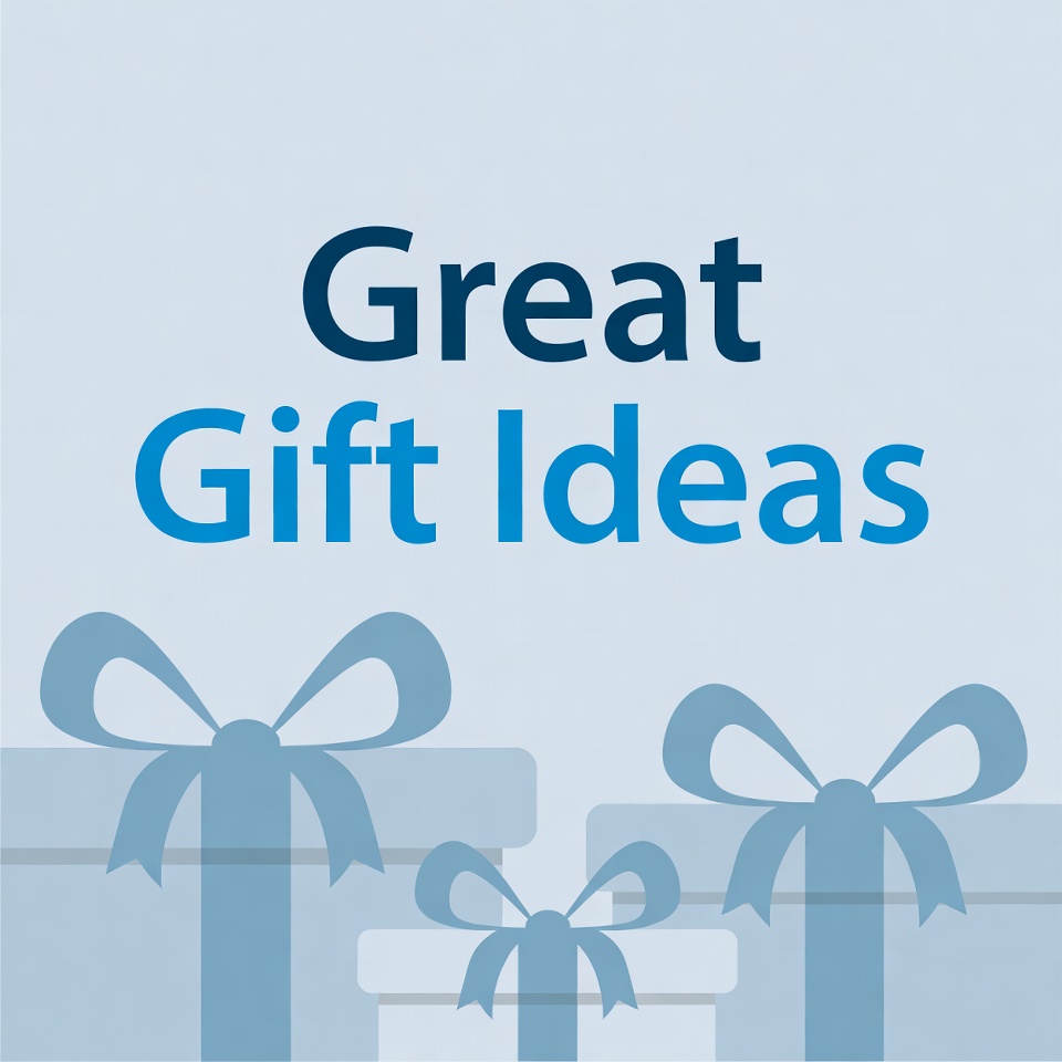 A clipart illustration features the bold blue text 'Great Gift Ideas' on a light blue background. Below the text are three gray gift boxes wrapped with matching gray ribbons and bows. The design is simple and festive, ideal for holiday or birthday promotions.