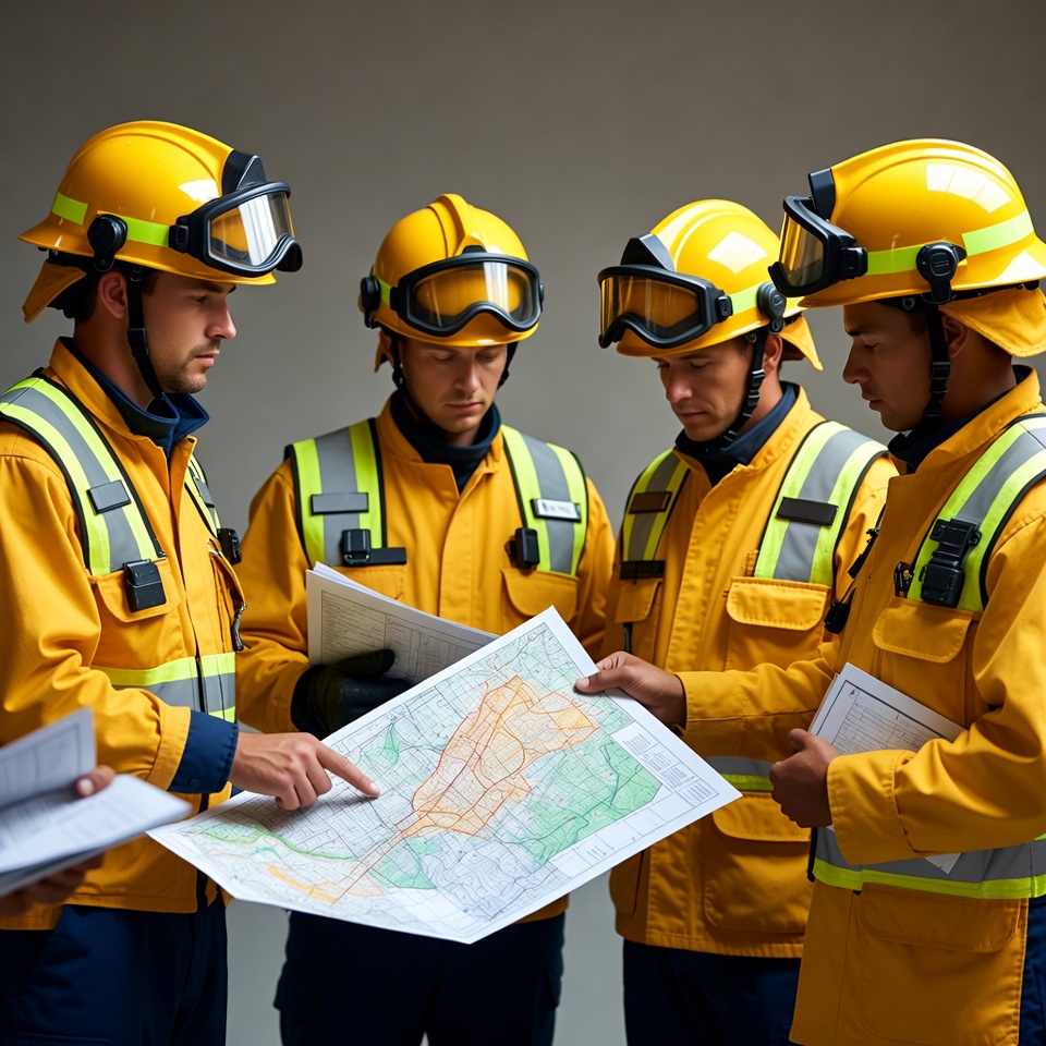 Four male firefighters in yellow helmets and high-visibility suits stand closely examining a large detailed map. They wear protective goggles on their helmets and gloves while pointing at sections of the map. The group is gathered in an indoor setting with a plain gray background.