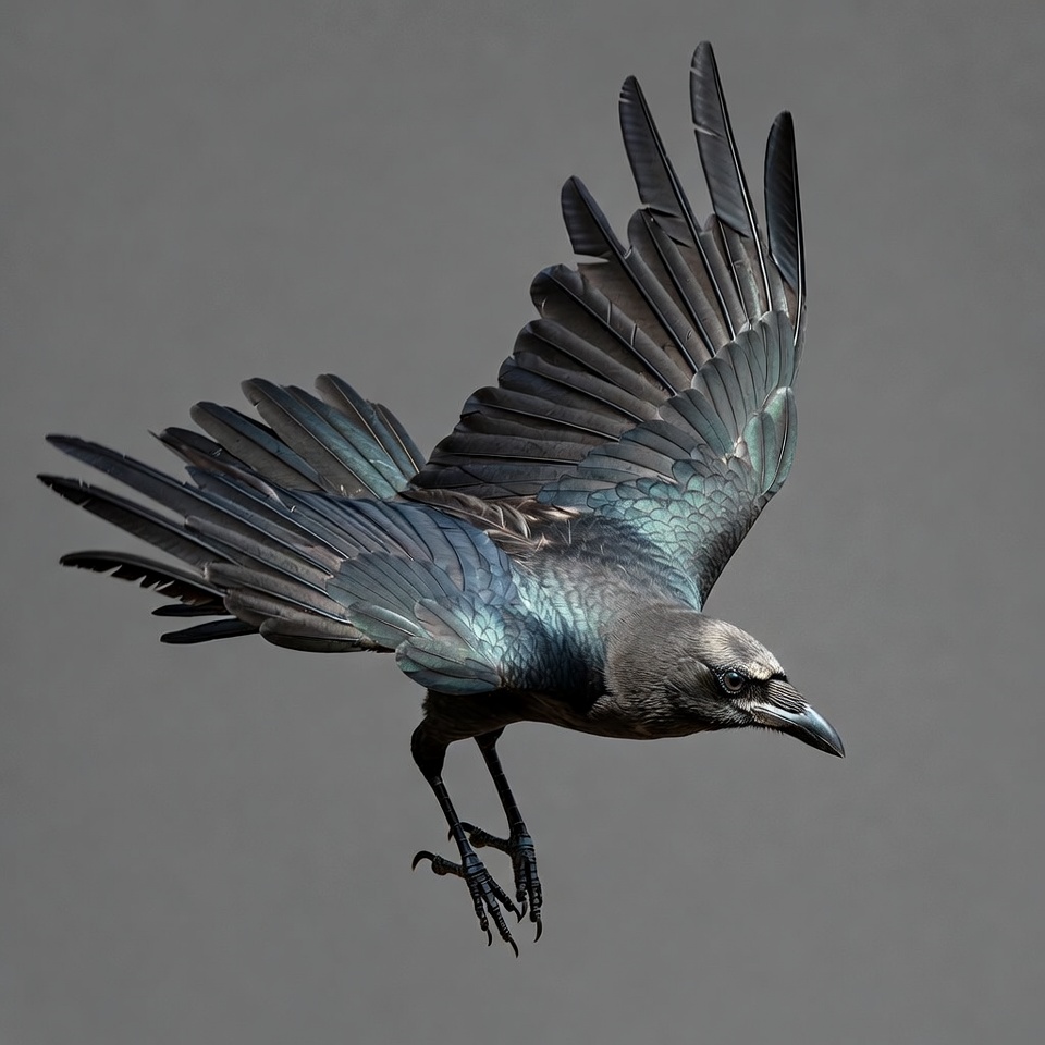 animal, beak, bird, black bird, corvid, crow family, feathers, flying bird, flying raven, gray background, iridescent feathers, isolated background, spread wings, talons, wildlife, wings, raven