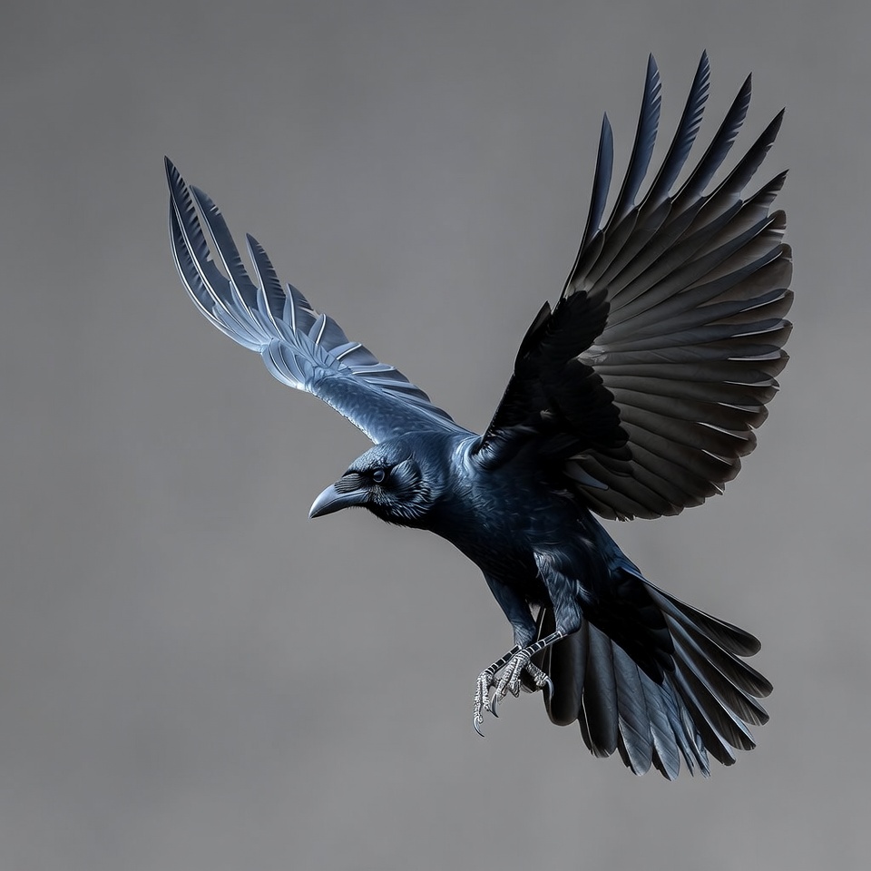 A large black raven flies with its wings fully extended against a plain gray background. Its feathers display subtle blue highlights, and its sharp beak and talons are visible. The bird is captured mid-flight in a dynamic pose.
