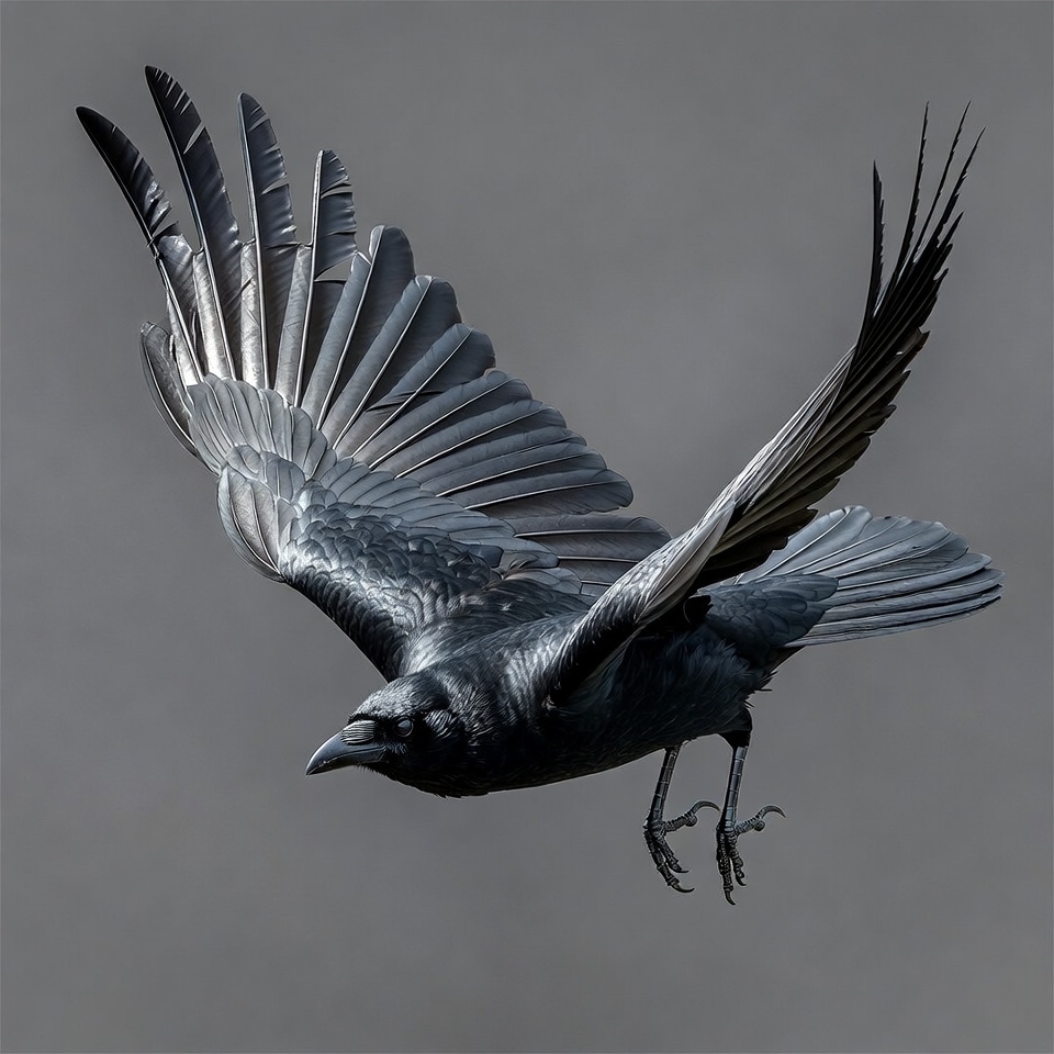 A large black raven flies with its wings fully extended against a plain gray background. Its feathers gleam with metallic sheen, and sharp talons are visible beneath. The bird's head is turned slightly, showing its curved beak.