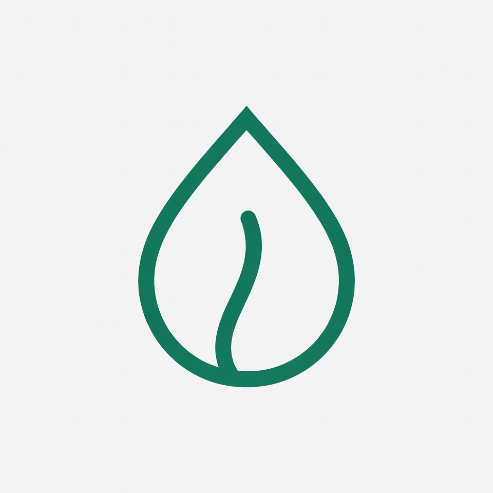 A simple green water drop icon features a curved leaf stem inside it. The design is outlined in dark green on a white isolated background. It has a clean, minimalist vector style.