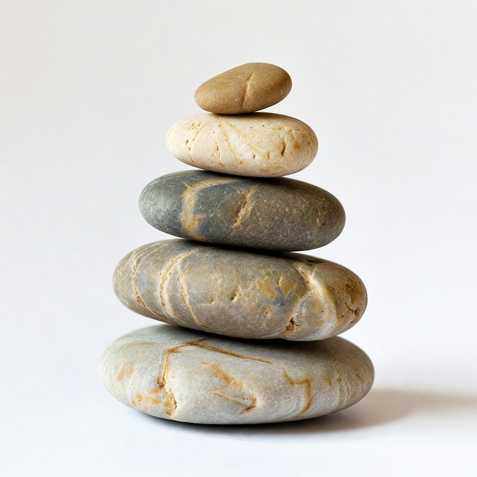 A stack of five smooth pebbles is perfectly balanced in a pyramid shape. The stones vary in size and color from gray to beige and white. They are centered against a plain white background.