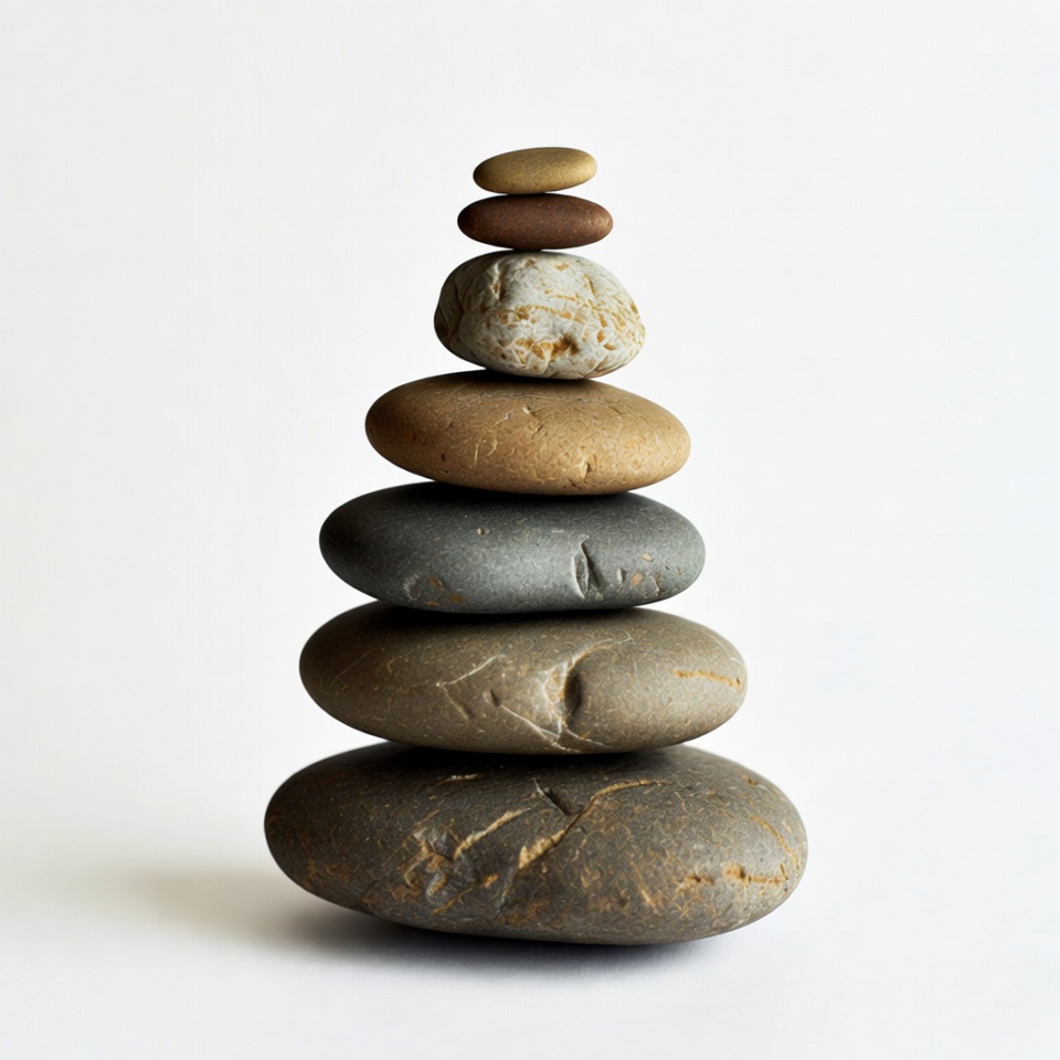 A tall stack of smooth pebbles balances precariously on a plain white surface. The stones vary in size, color, and texture, with grays, browns, and tans forming a pyramid shape. They are arranged in perfect vertical alignment against the isolated background.