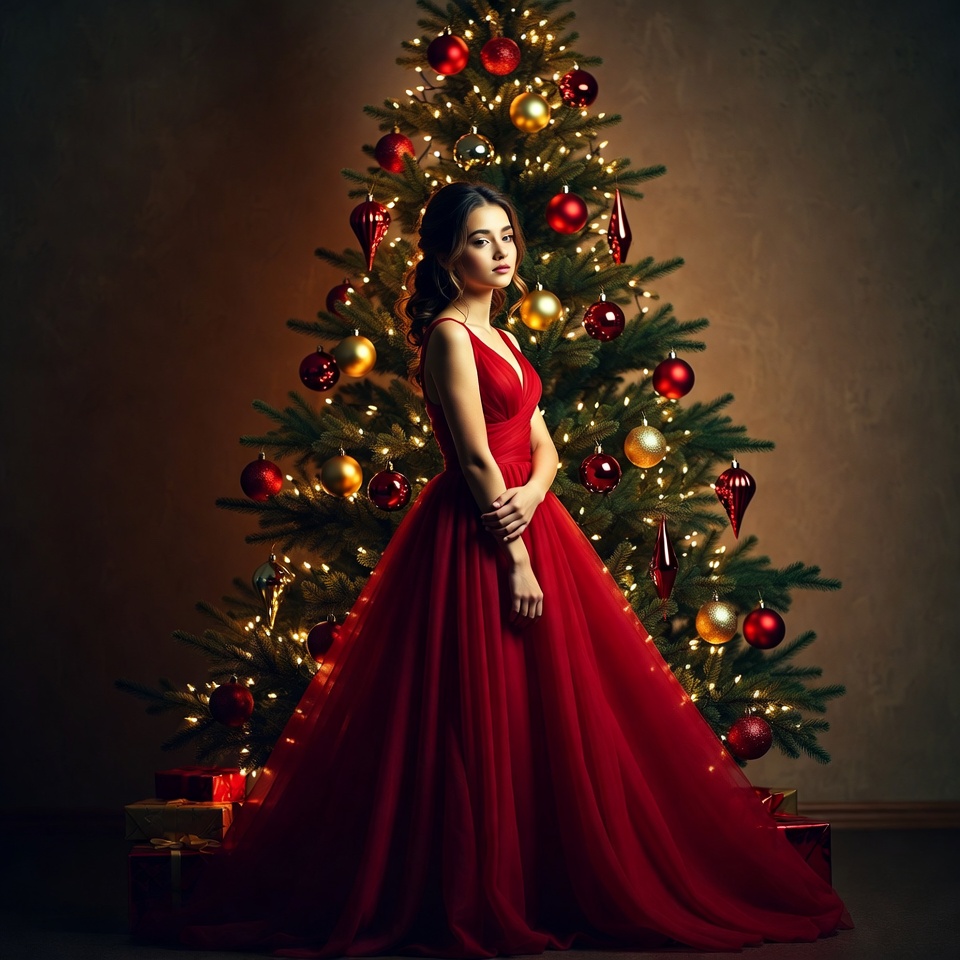 A young woman with brunette hair stands in a flowing red evening gown next to a lit Christmas tree adorned with red and gold ornaments. She poses with arms crossed, smiling softly in a warmly lit room. Gift boxes are placed at the base of the tree.