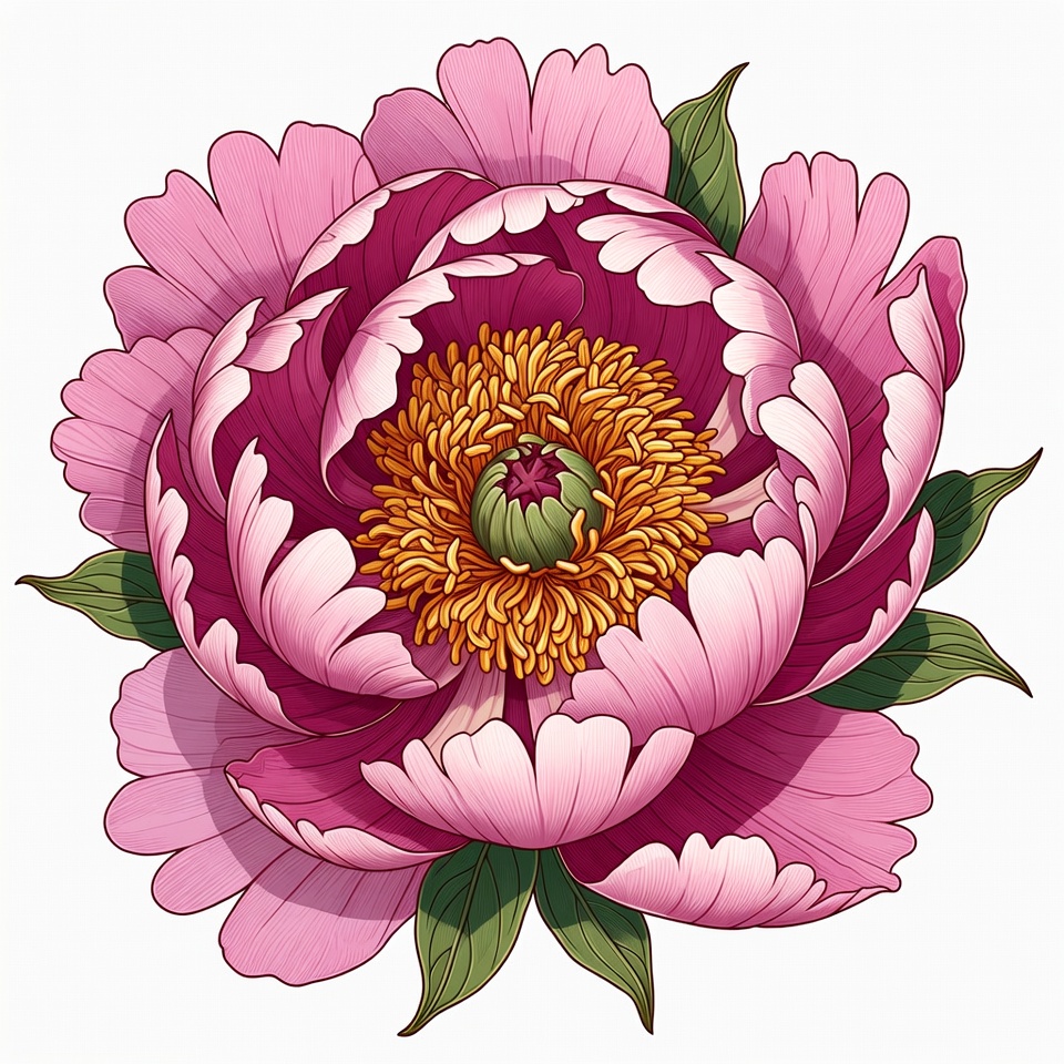 bloom, clipart, digital art, floral, flower, flower art, green leaves, illustration, isolated background, magenta petals, orange center, peony illustration, petals, pink peony, vibrant flower, peony
