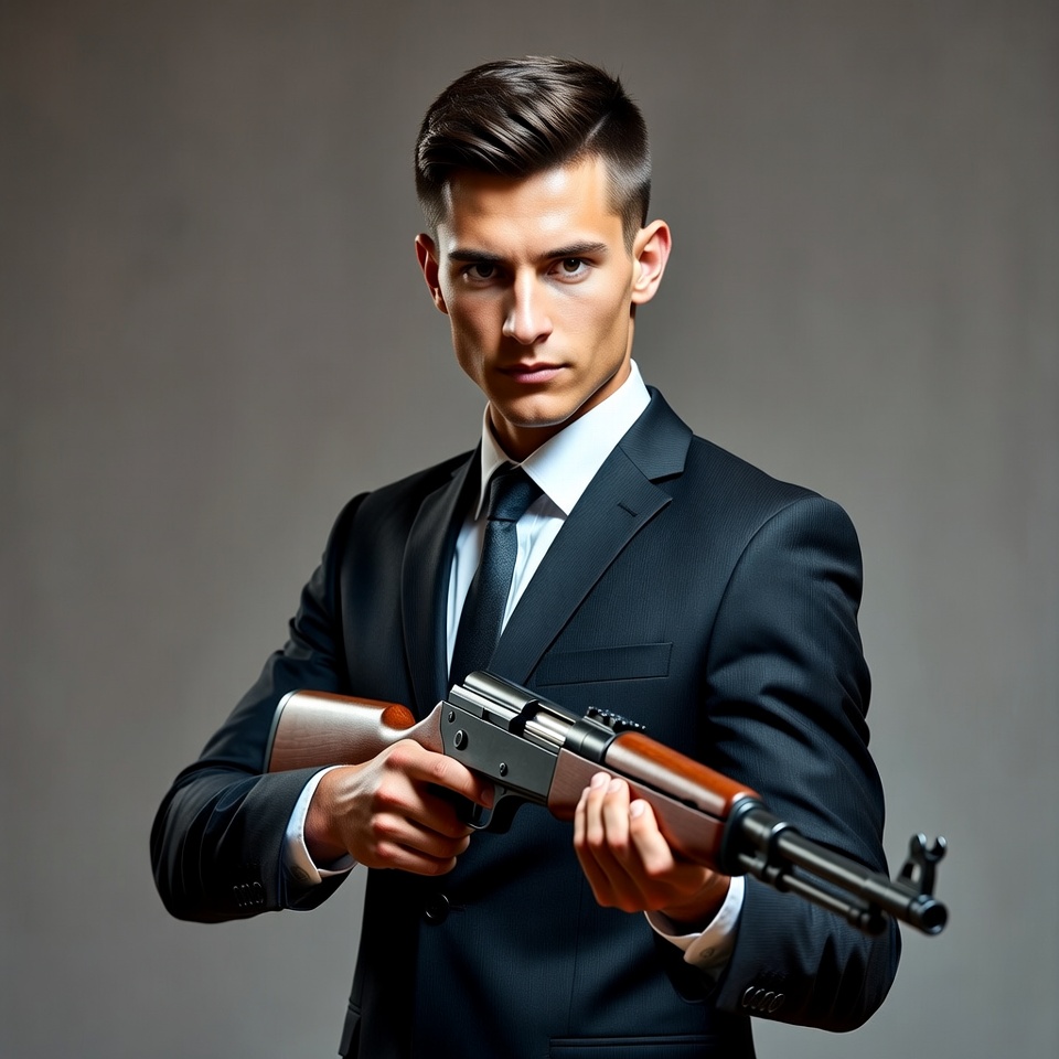 A young White man with short dark hair stands confidently in a dark suit and tie against a gray background. He grips an AK-47 rifle with both hands, pointing it forward. His expression is serious and focused.