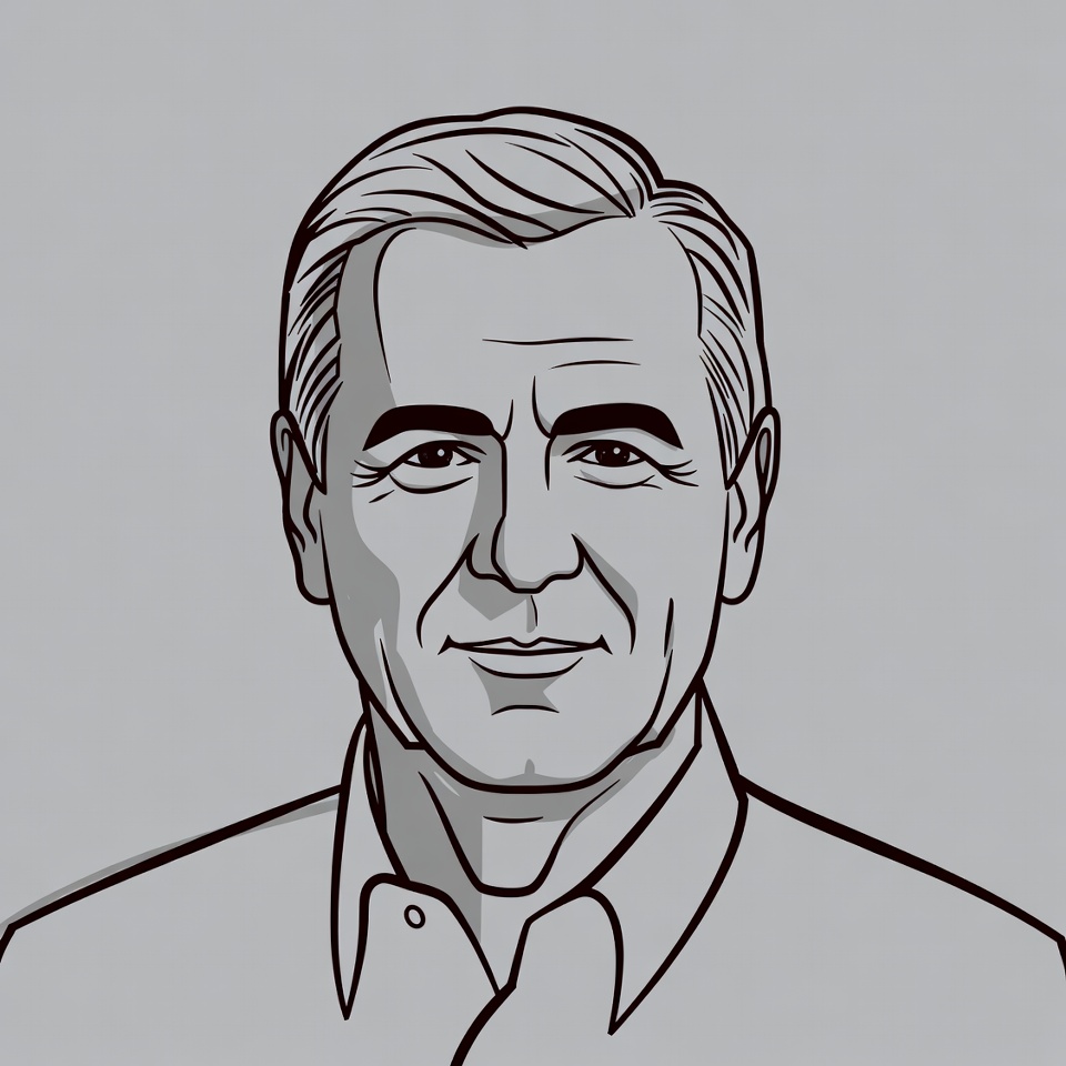 A black line art illustration depicts the head and shoulders of an older man with short wavy gray hair and a serious expression. He wears a collared shirt with the top button undone. The portrait is rendered in a clean, minimalist style on a light gray background.