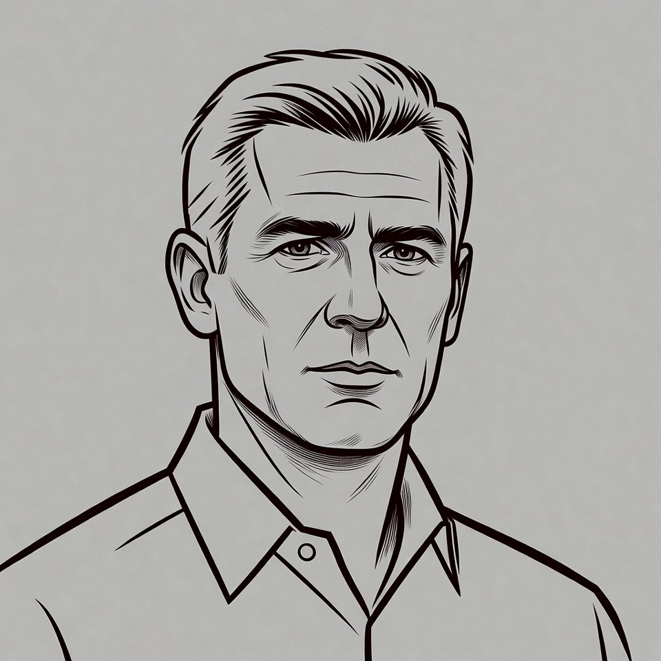 A detailed line art illustration of a mature man with short combed-back hair and a serious expression. He wears a collared shirt with buttons visible. The portrait is set against a plain gray background.