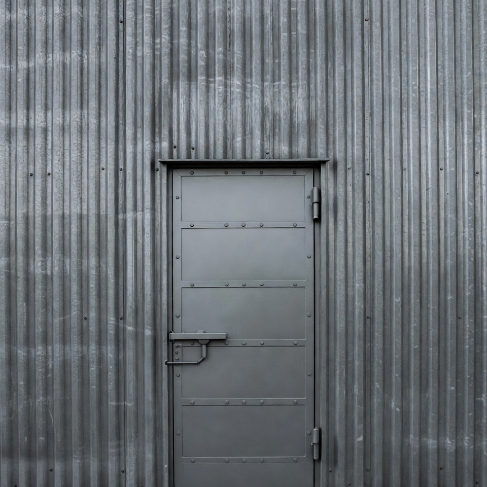 A sturdy gray metal door with horizontal reinforcements is centered on a tall corrugated metal wall. The wall features vertical ridges and subtle weathering. A handle and hinges are visible on the door against the industrial background.