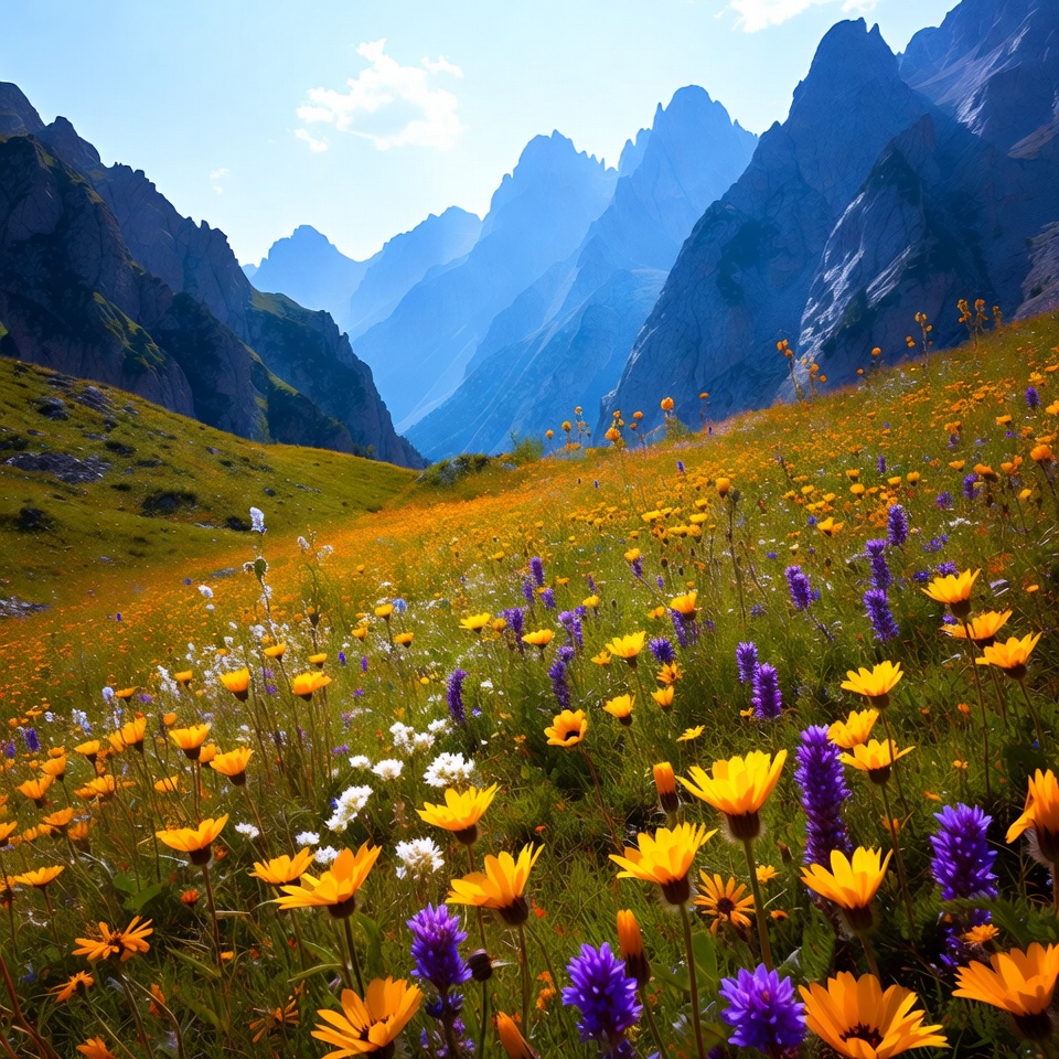 A vibrant meadow filled with yellow and purple wildflowers covers the green hillside in a sunny alpine valley. Towering jagged mountains rise sharply in the background under a clear blue sky with scattered white clouds. The scene features lush grass, colorful blooms, and distant misty peaks.