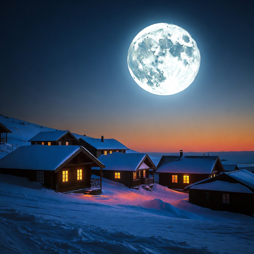 Cluster of wooden cabins covered in snow sits on a snowy hillside at night. A large full moon glows brightly in the dark sky above the illuminated cabins. Orange sunset hues blend with the blue night sky in the background.