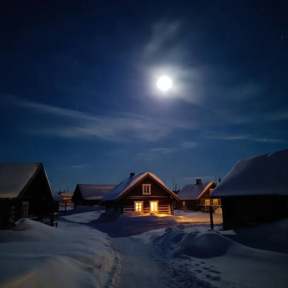 cabin windows, clouds, cold weather, dark blue sky, frosty roofs, full moon, glowing lights, illuminated cabin, log cabins, moonlight, night sky, remote village, snow, snowy path, snowy village, stars, winter landscape, winter night, wooden houses, snowy cabins