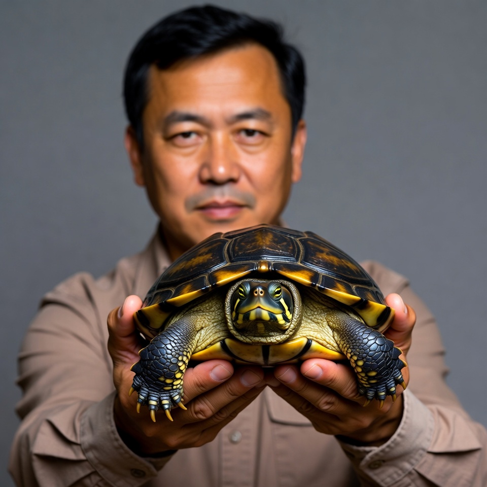 An Asian man with short black hair holds a small turtle with a dark shell and yellow markings in his hands. He wears a light brown shirt and gazes at the turtle against a gray background. The turtle faces forward with its head extended.