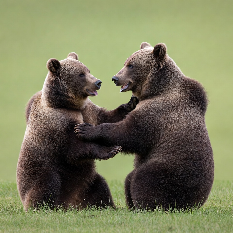 Two brown bears stand on their hind legs facing each other on a green grassy field. They playfully wrestle with paws gripping each other's shoulders and mouths open in friendly interaction. Their thick fur is detailed against the natural outdoor background.