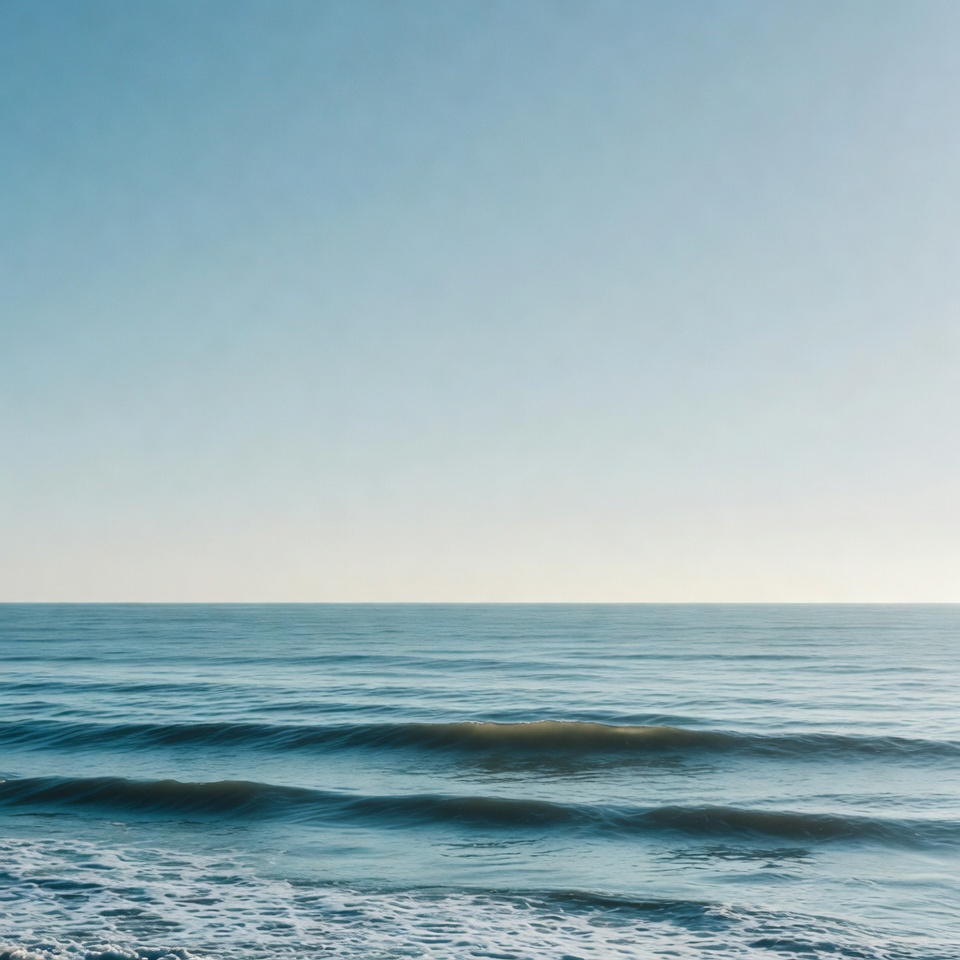 Gentle ocean waves roll towards the shore under a clear light blue sky. The water displays shades of blue and turquoise with white foam on the crests. The horizon line separates the sea from the expansive sky.